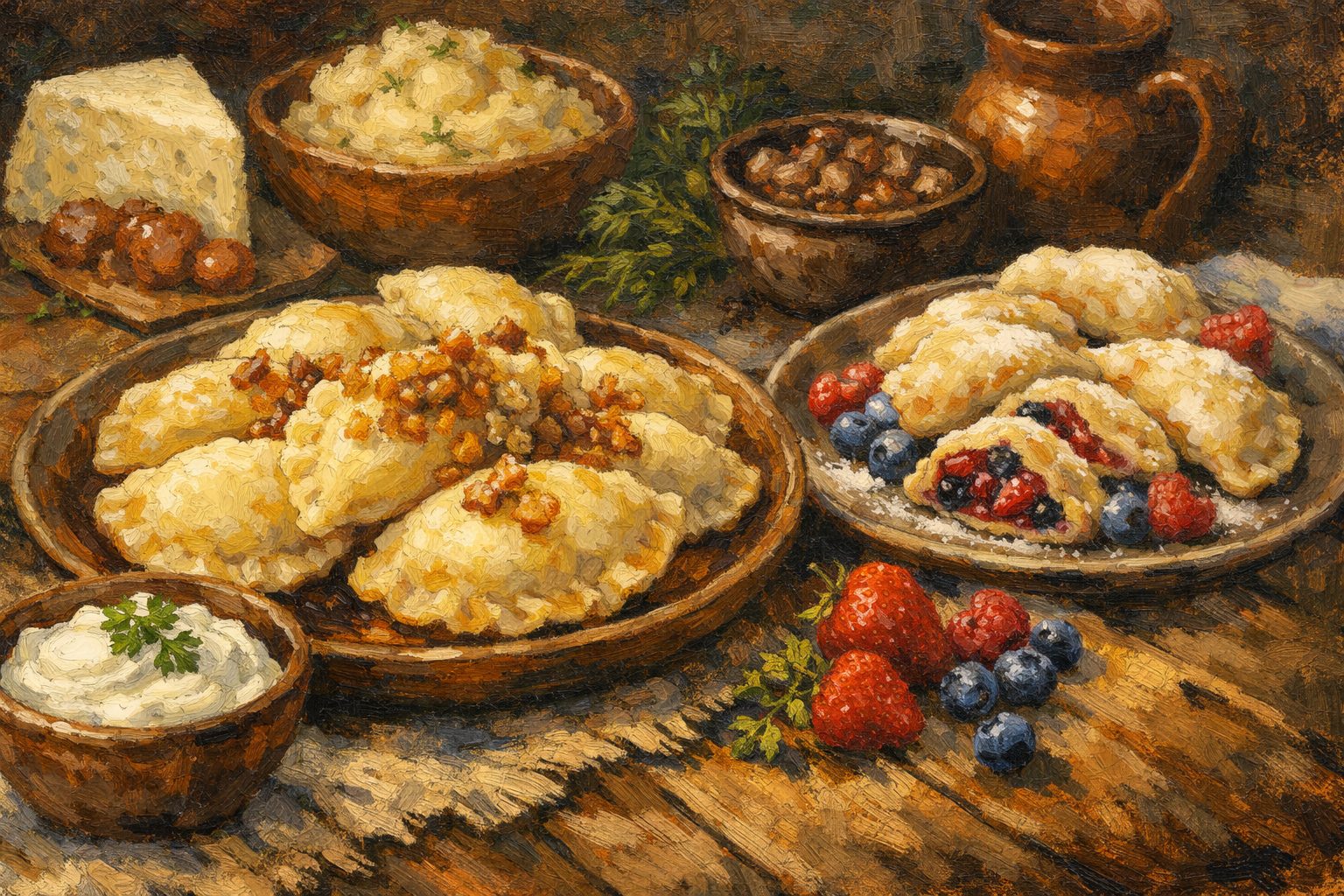 ピエロギは具の方向で、主食寄り・おかず寄り・デザート寄りに分けて捉えやすいです。じゃがいもやチーズは主食寄りに振れやすく、肉やきのこは満足感のあるおかず寄りになります。フルーツや甘いチーズはデザート寄りで、砂糖やクリームで仕上げることがあります。